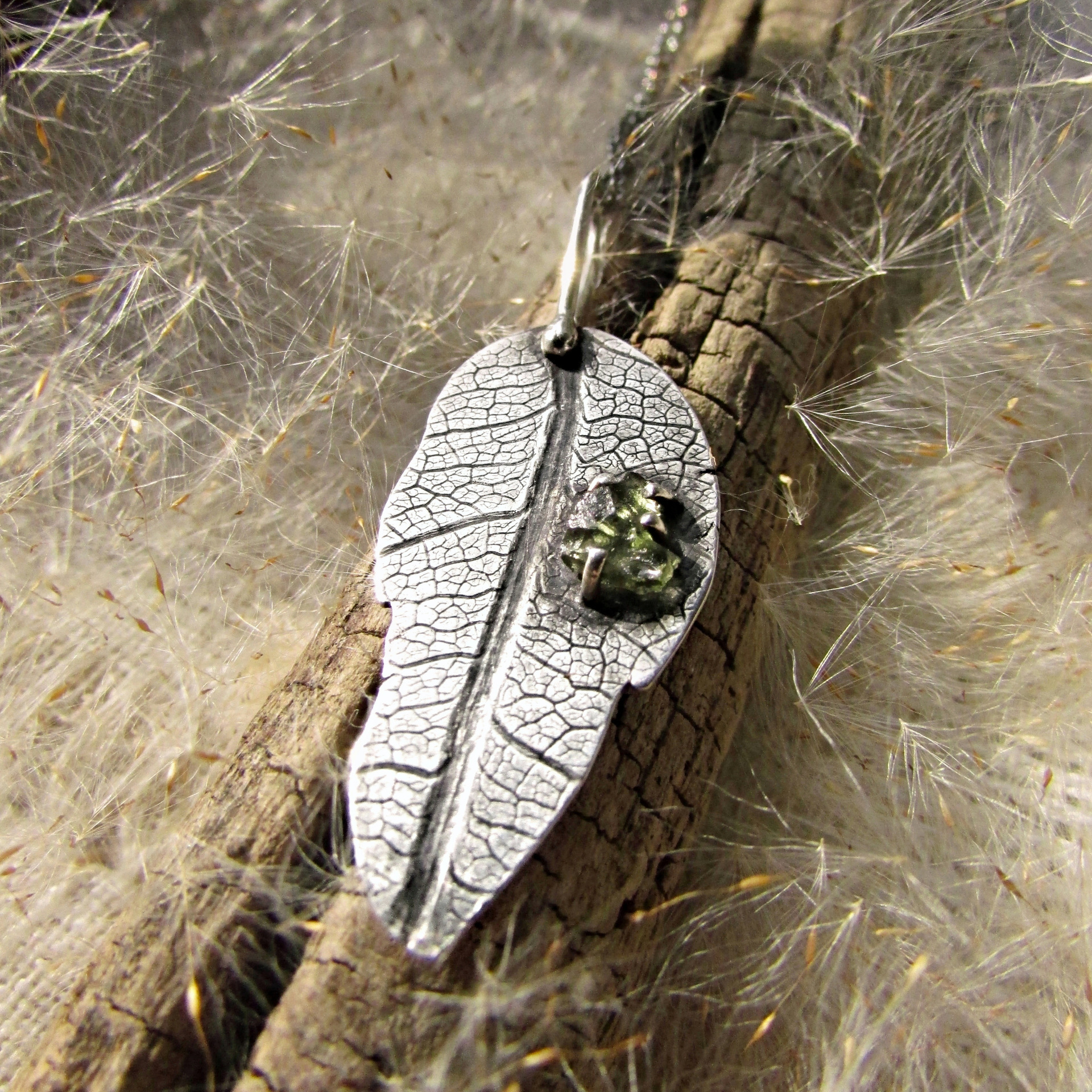 Lehký dotek přírody a lahvově zelený vltavín vetknutý do struktury listu. Originální ručně vyrobený šperk.