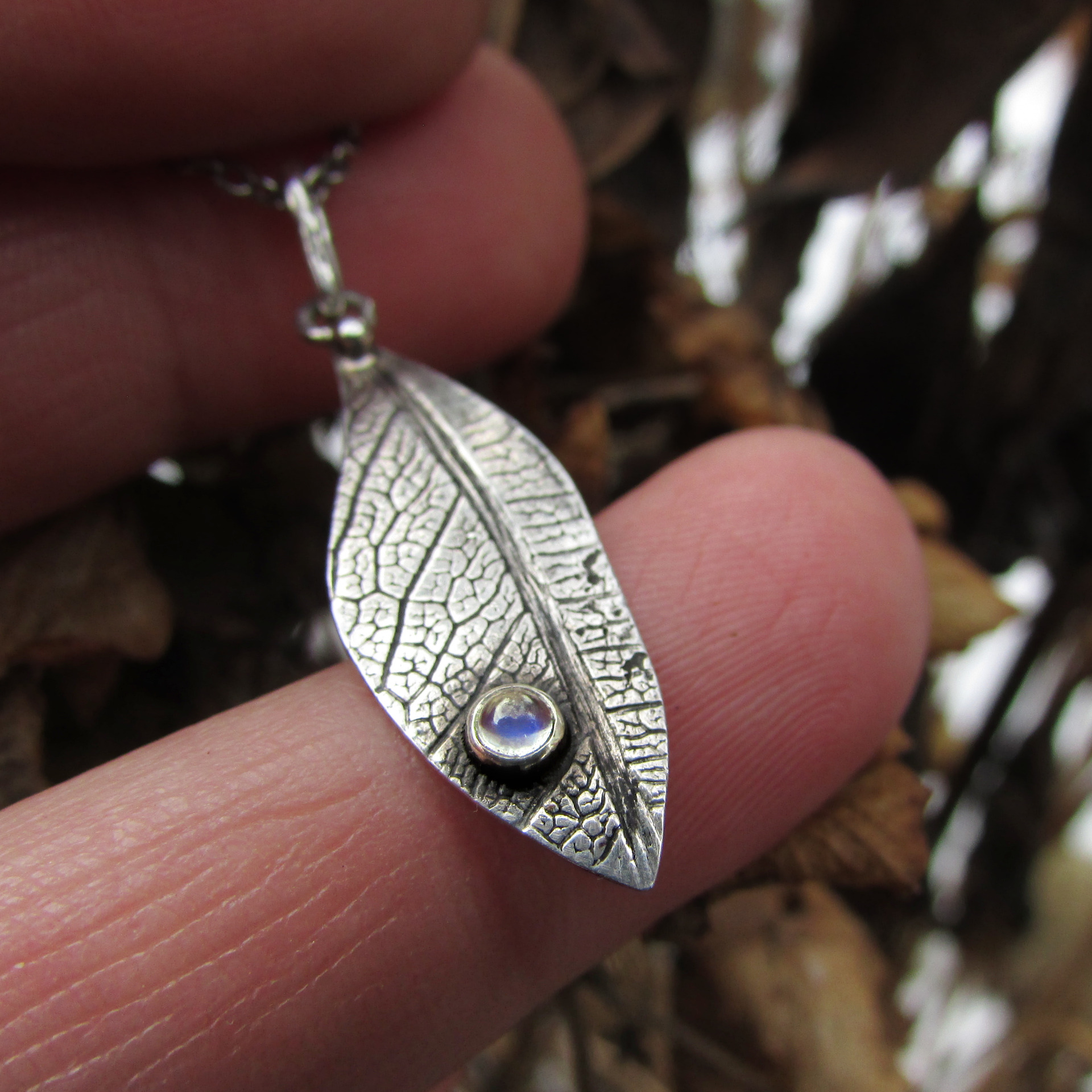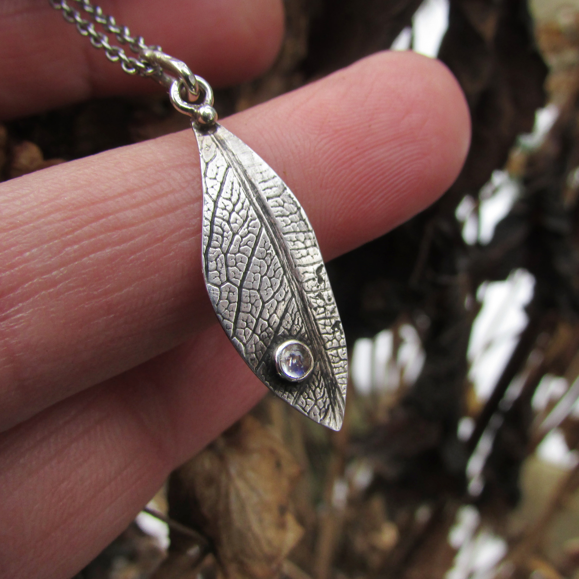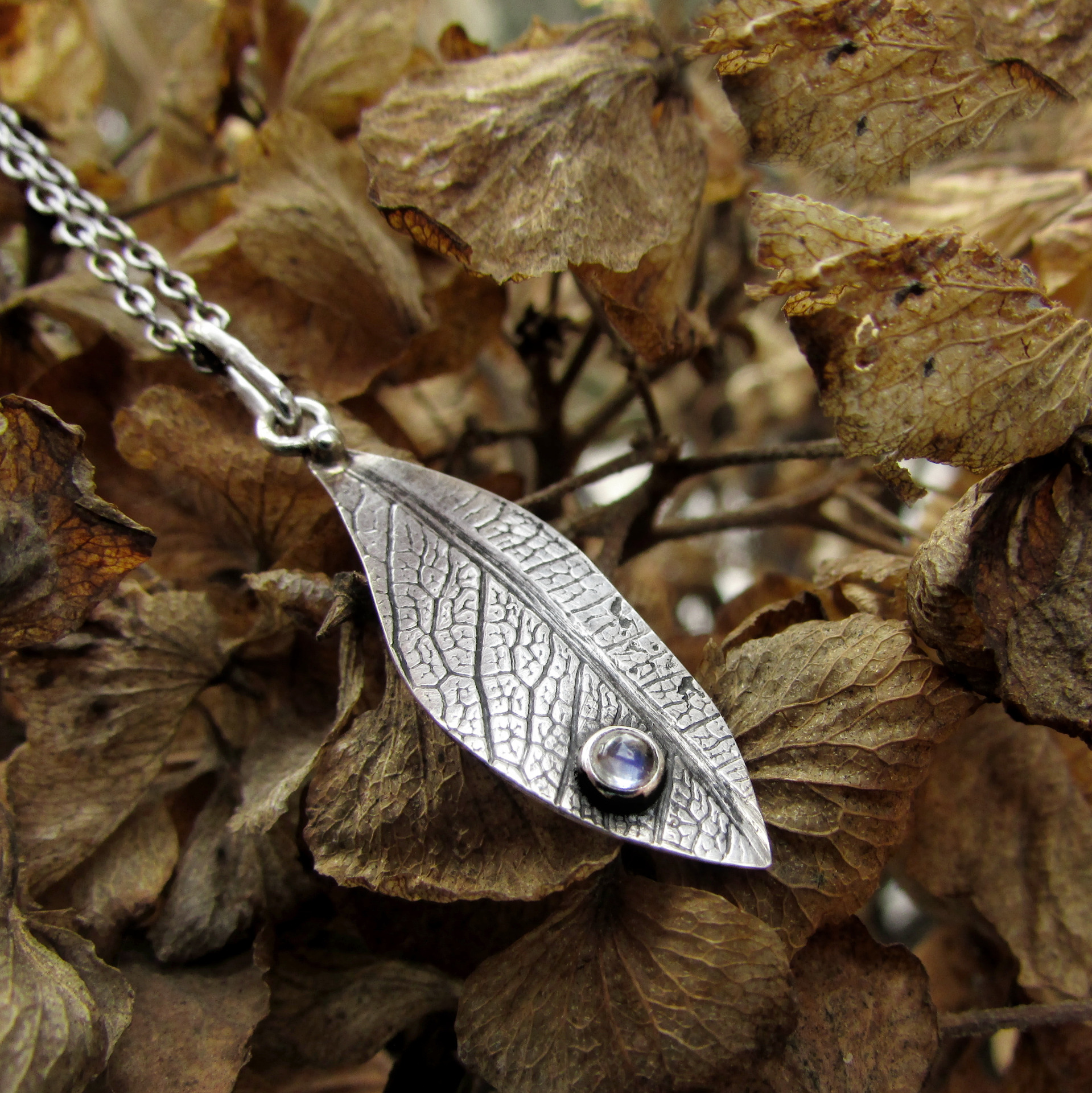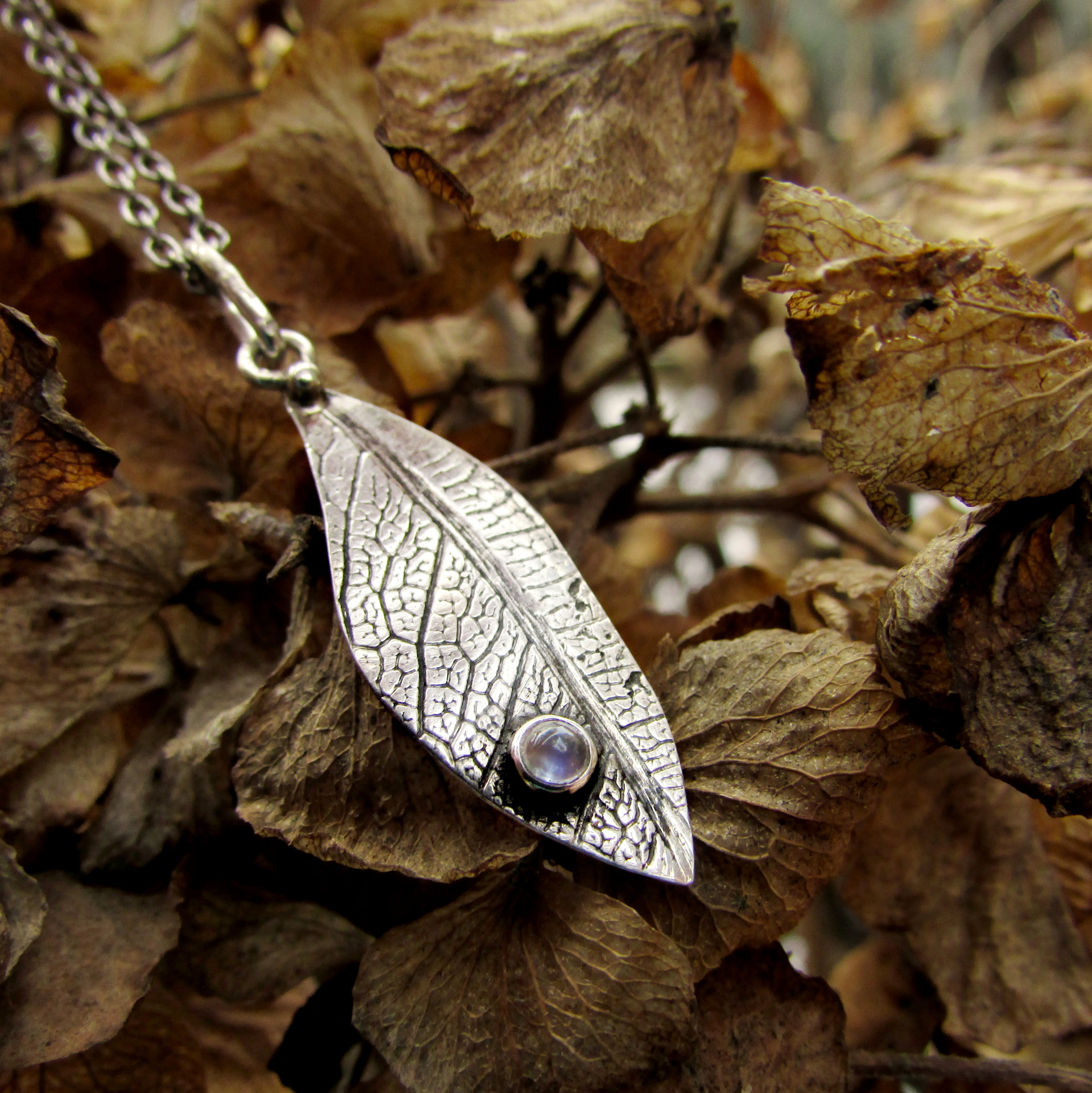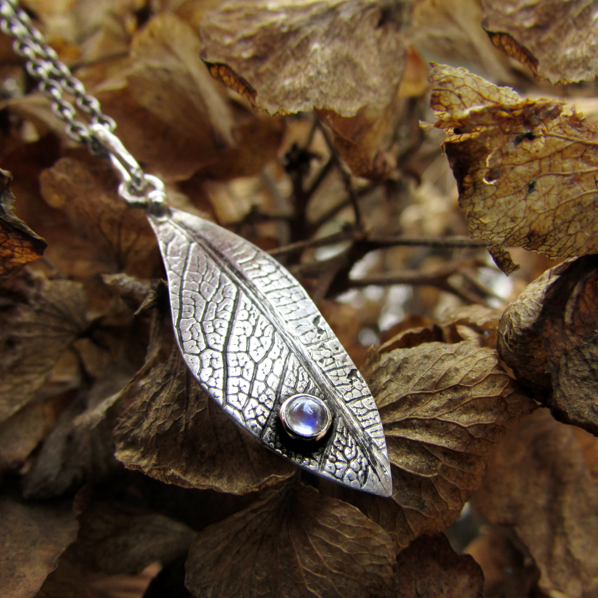 Lehký dotek přírody a měsíčního svitu vetkaný do struktury listu. Originální ručně vyrobený šperk.