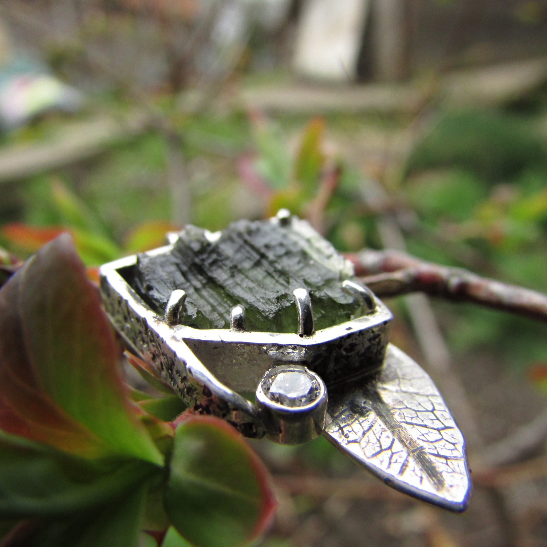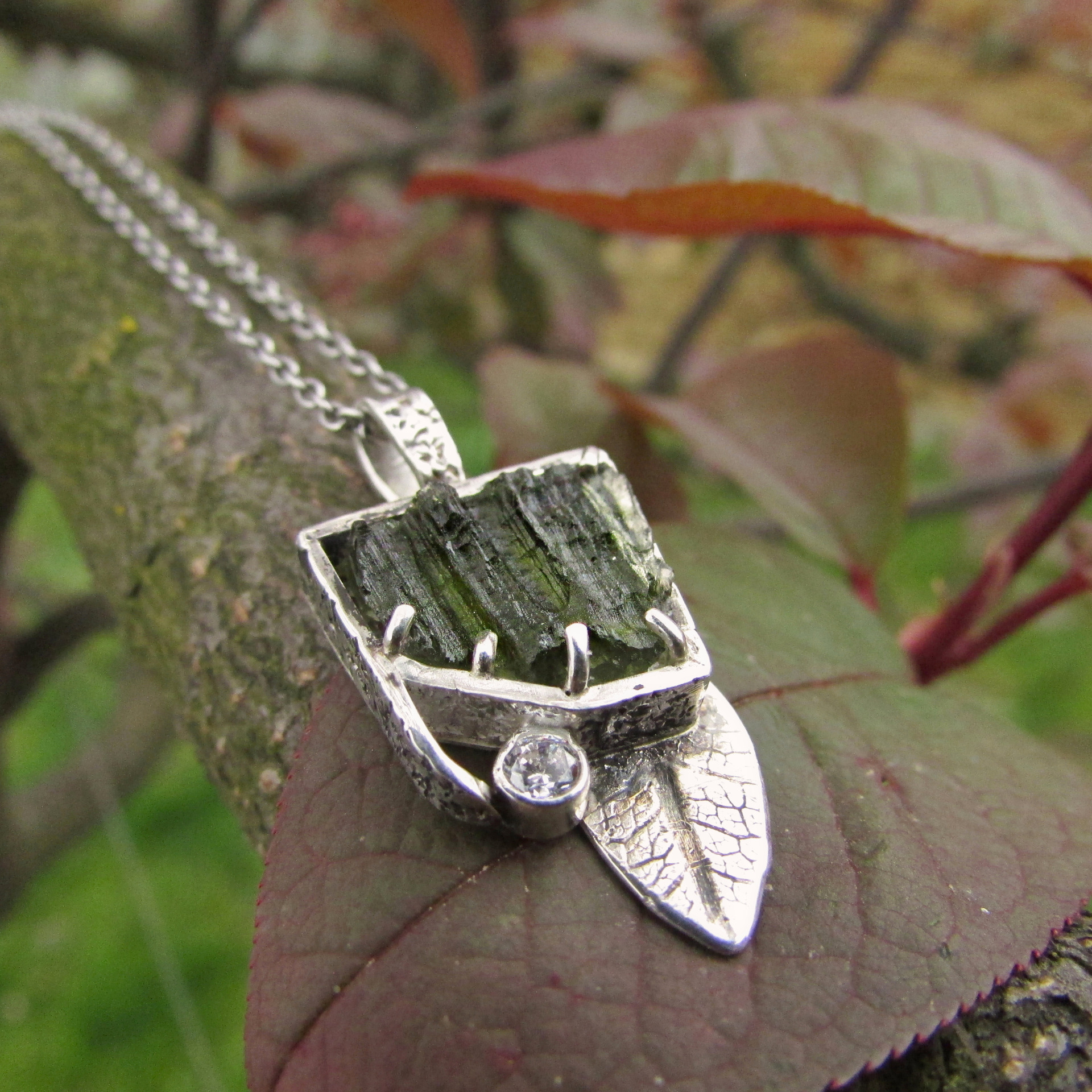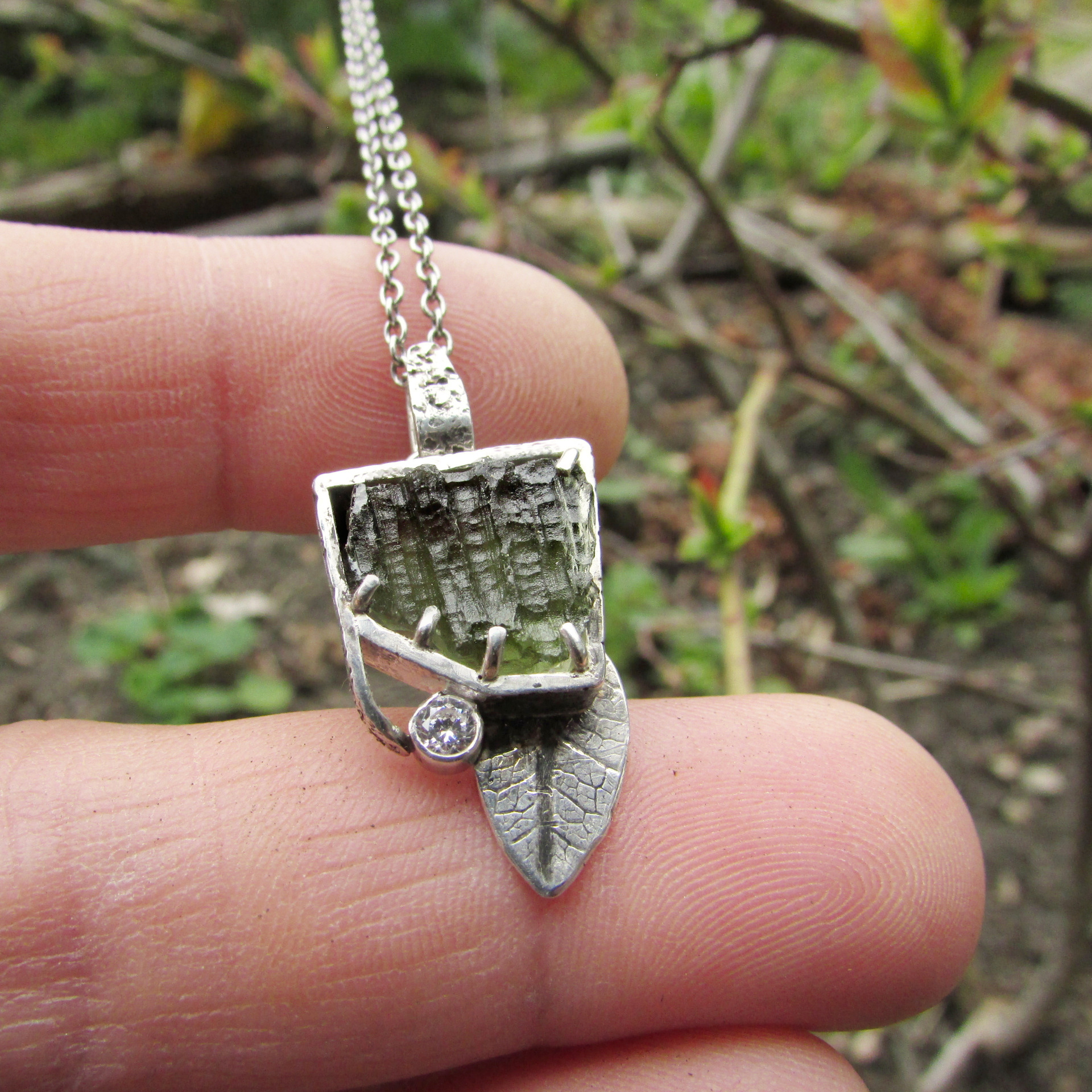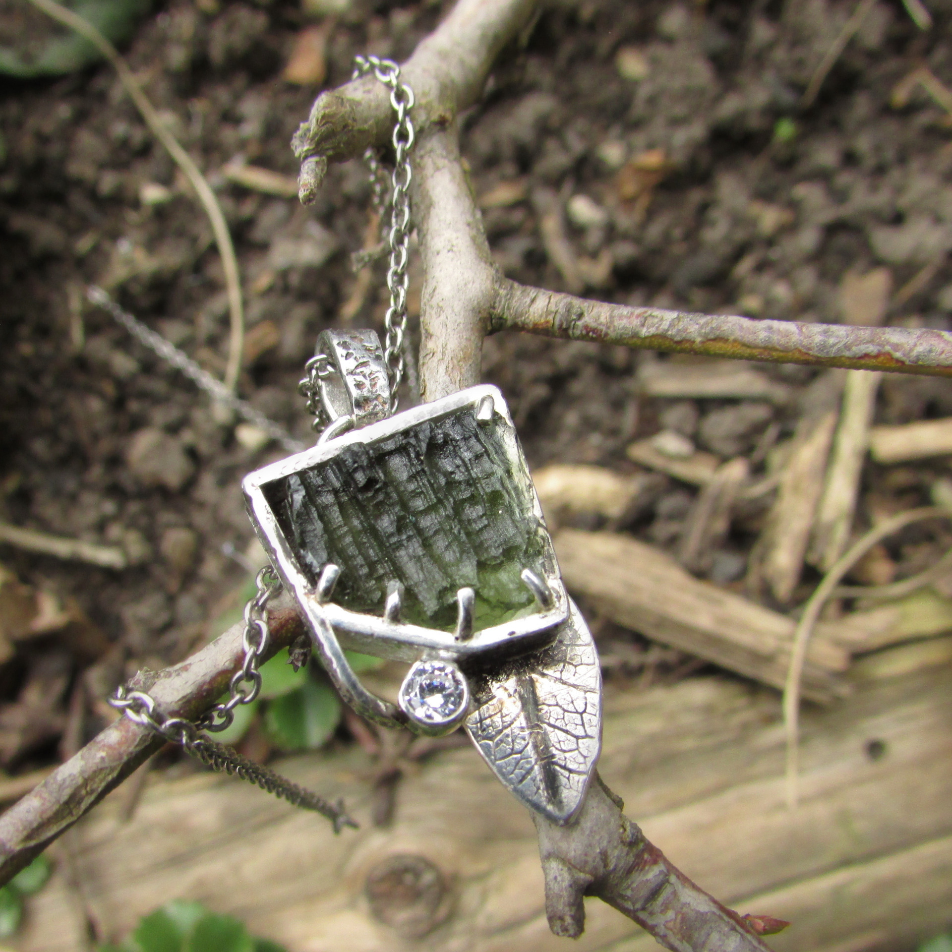 stříbrném kabátku a s drobným lístkem. Originální ručně vyrobený šperk.