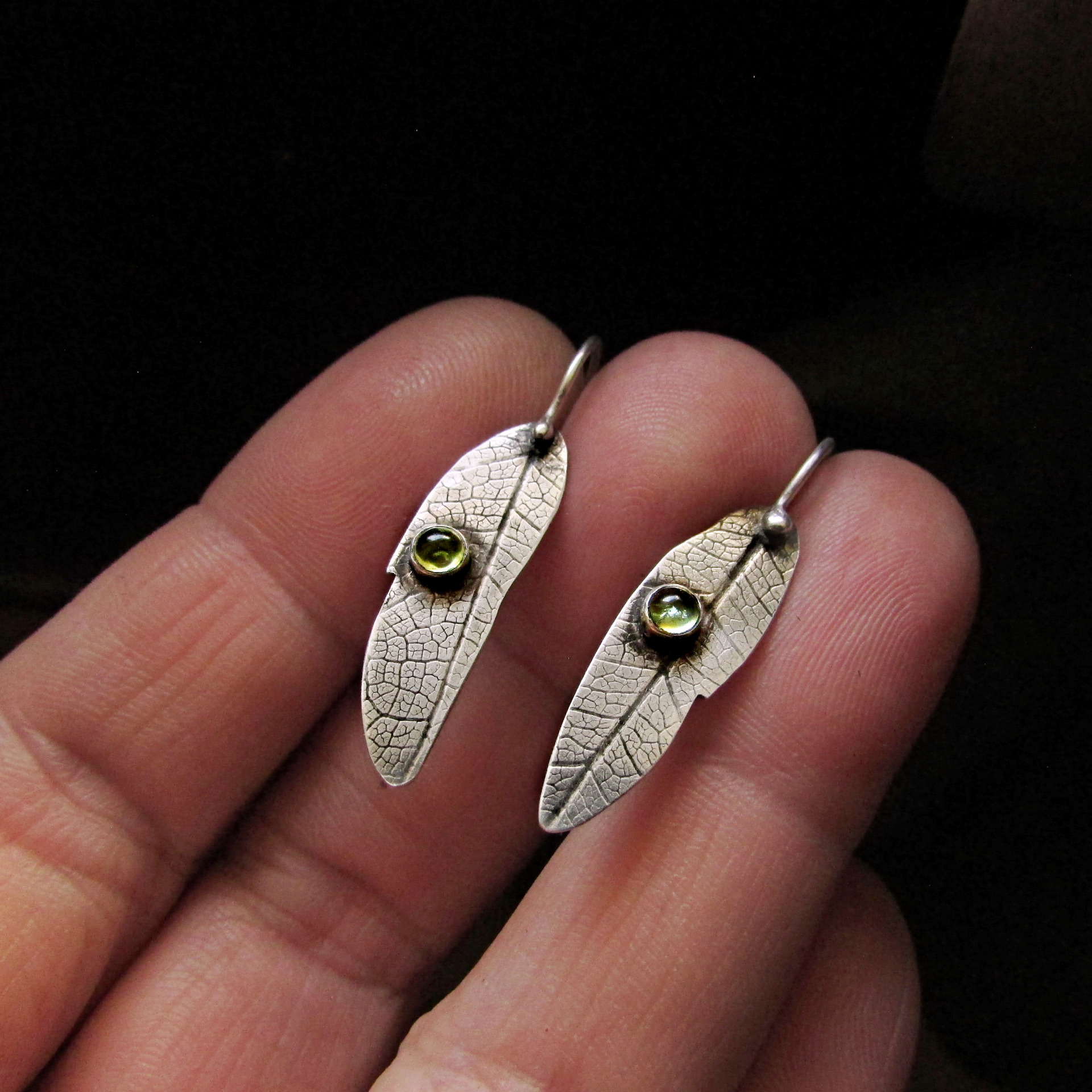 Lehký dotek přírody a zelených světýlek olivínu vetkaných do struktury listu. Originální ručně vyrobený šperk.