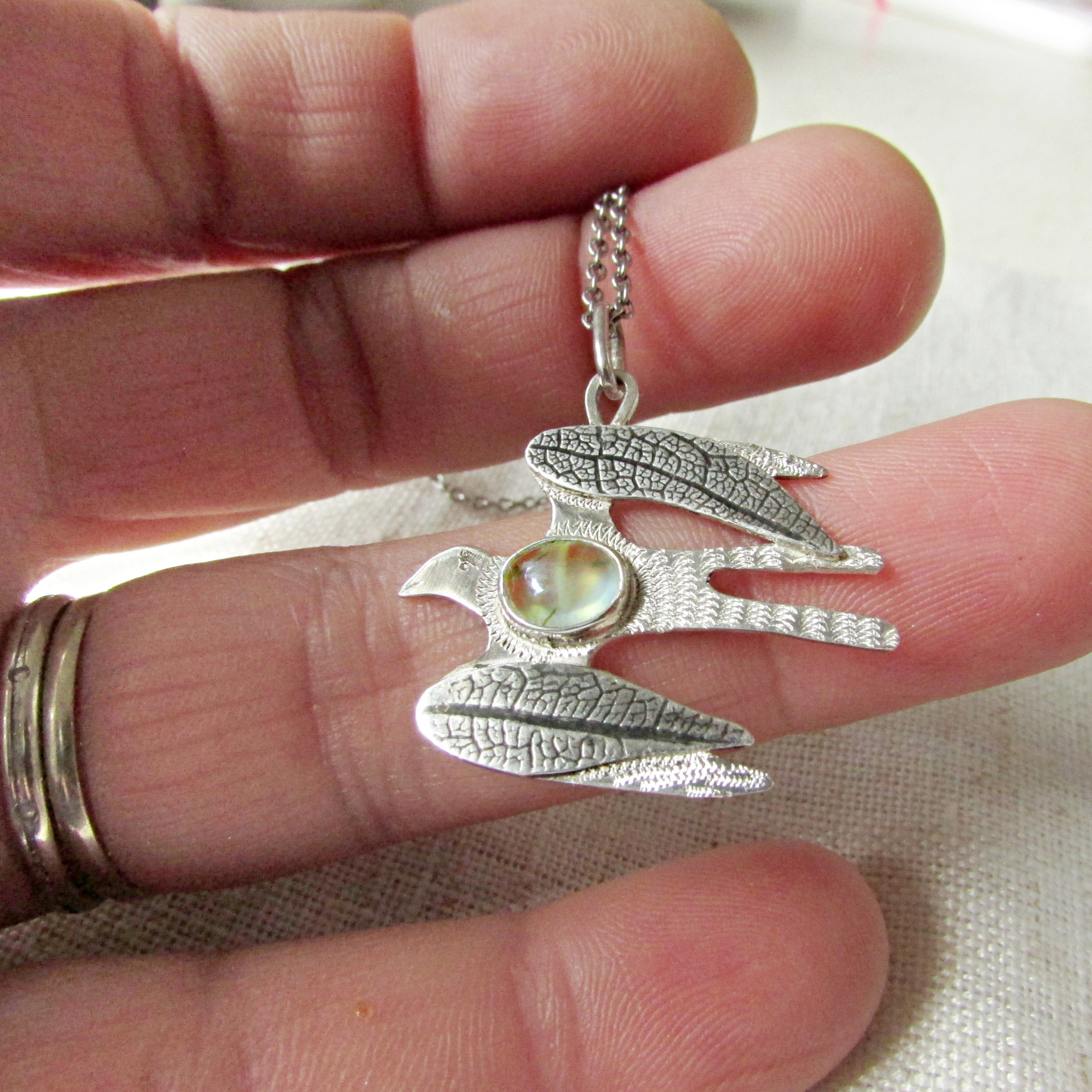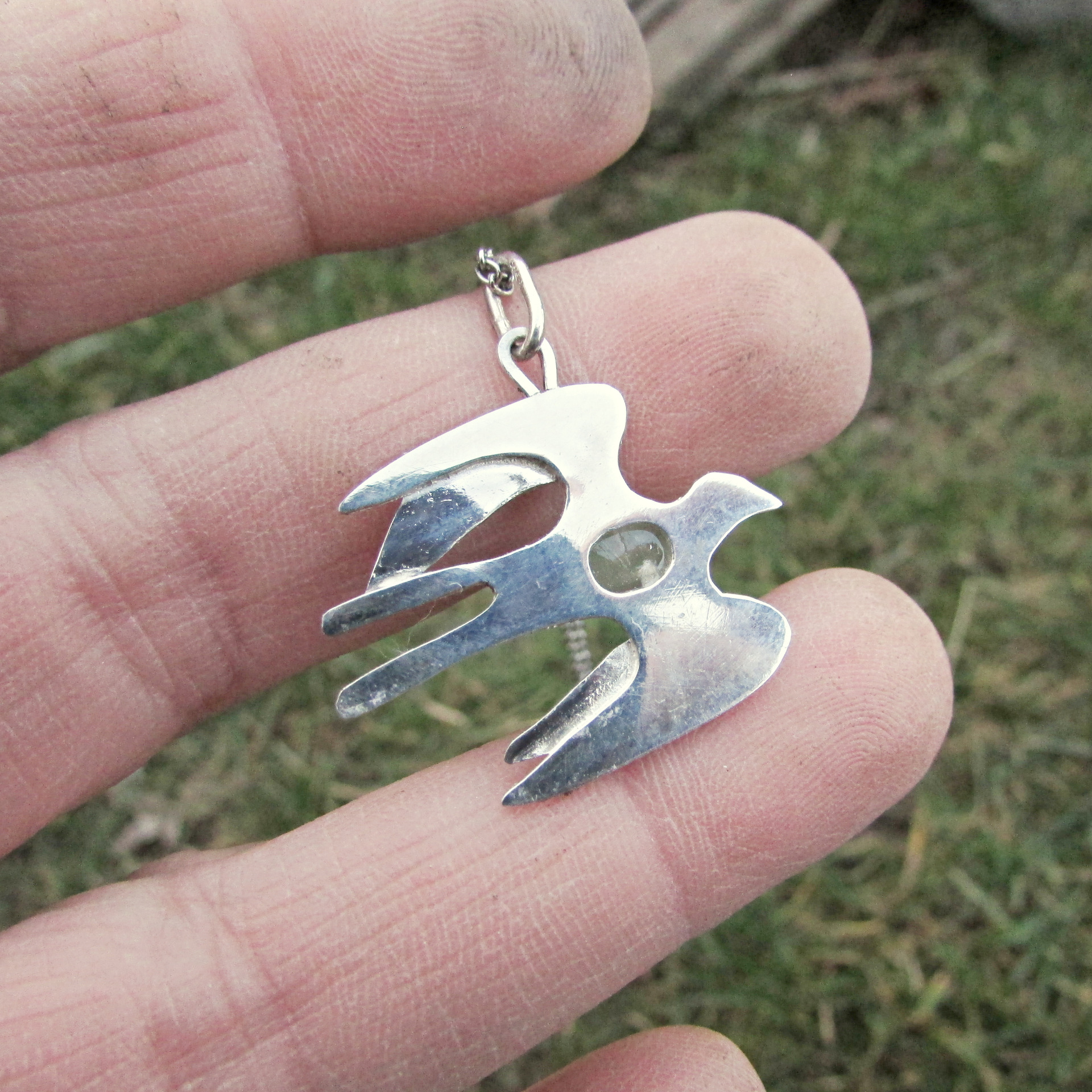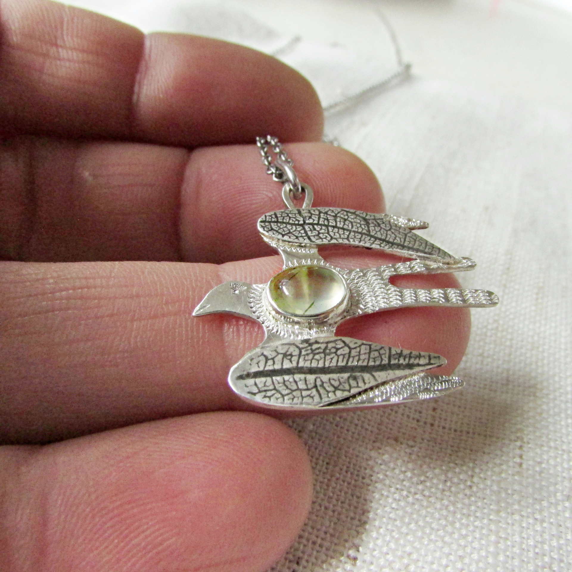 PROVEDENÍ: Celý přívěsek je KOMPLET RUČNÍ VÝROBA, bez použití jakéhokoliv komponentu. Zaručuji precizní a pečlivé zpracování, smysl pro detail. Šperk je vyroben klasickou zlatnickou technikou. Lůžko kamene je ze zadní strany volné a umožňuje tak prostupu světla zespodu kamene. Základní tvar vlaštovky je zdoben ruční rytinou, horní pírka křídel jsou ze strukturovaného stříbra, do kterého je vetkunuta struktura listu. Reliéf je plastický, podtrhuje jej tmavá patina. Motiv připomíná romantický folklorní vzor.
