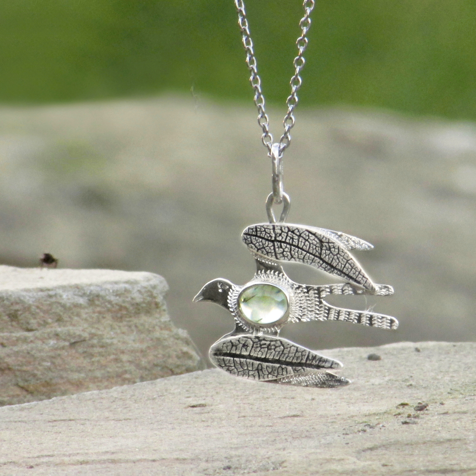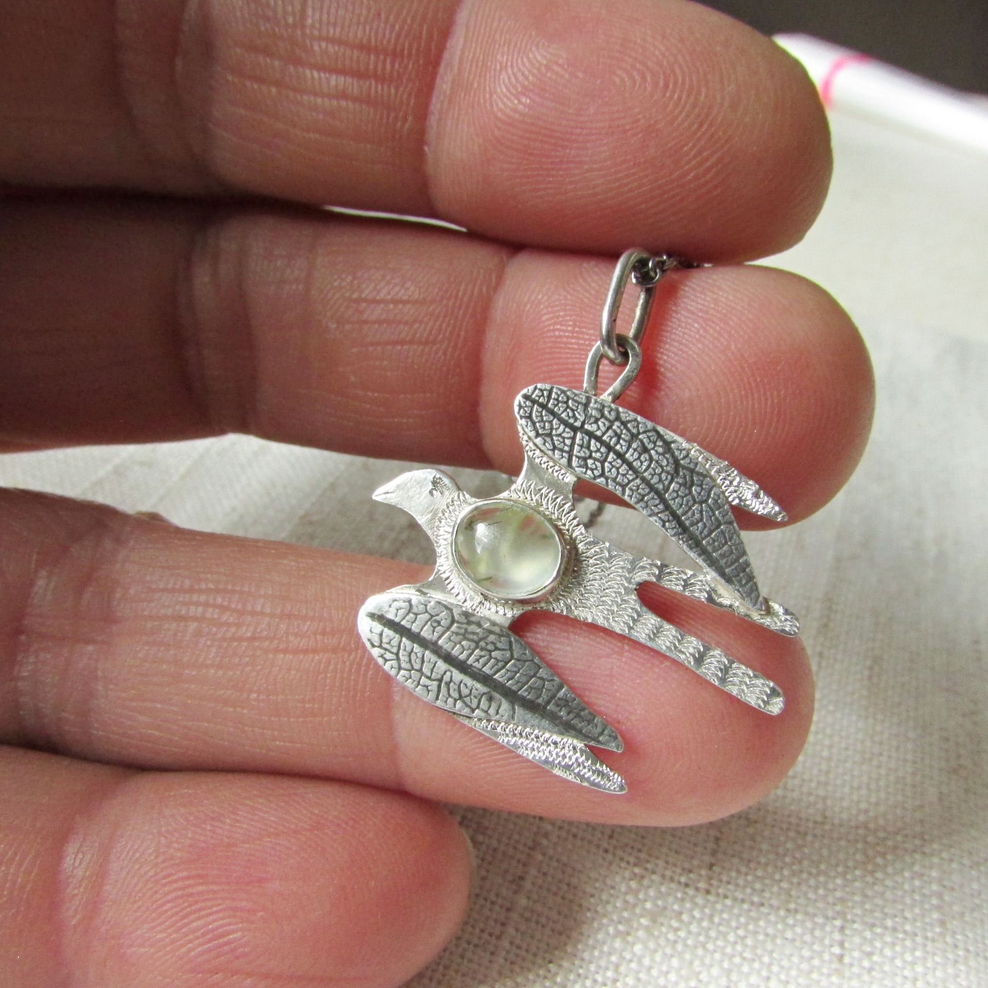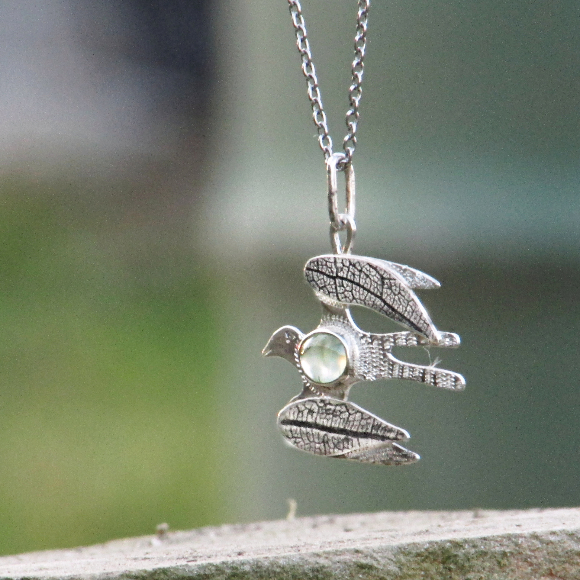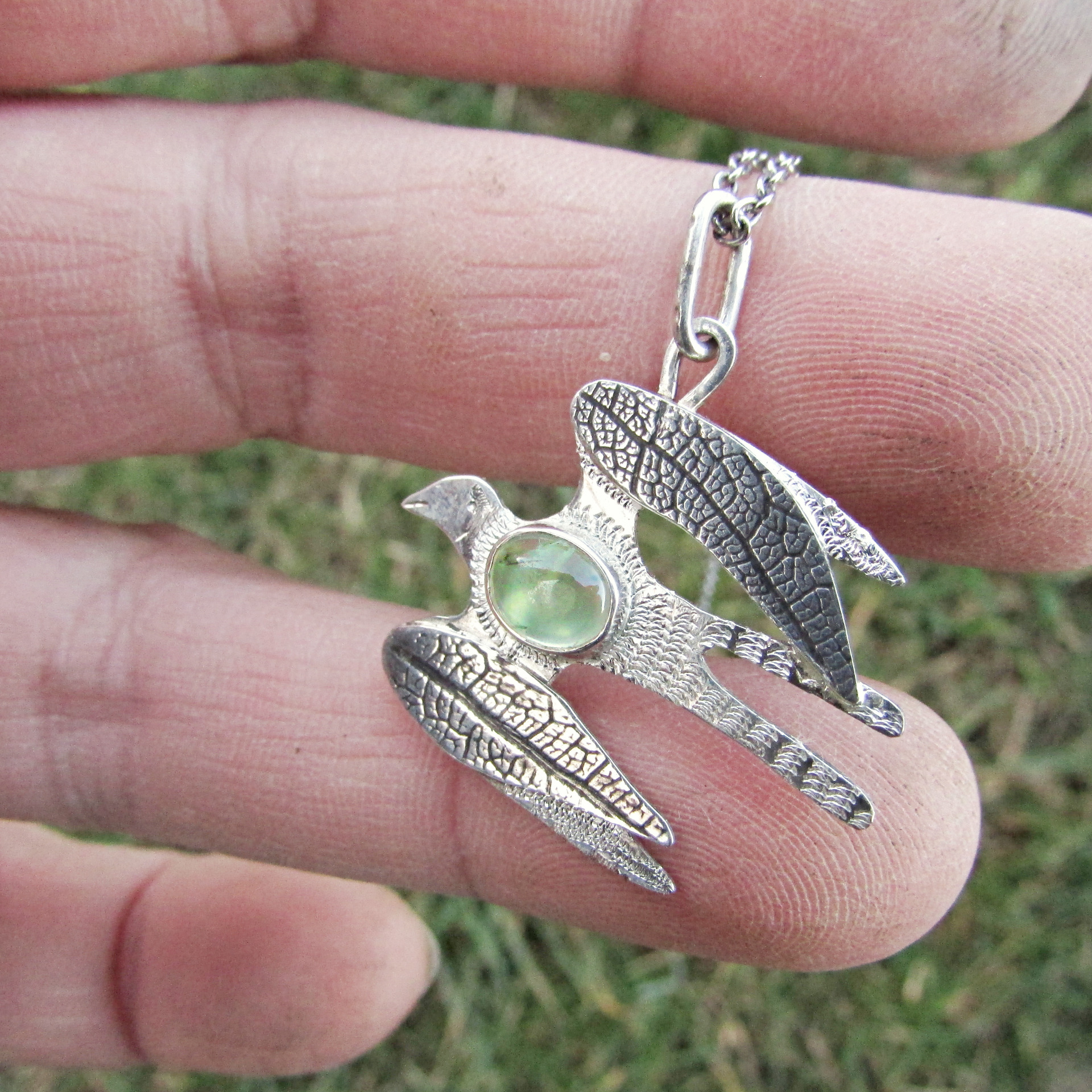 PROVEDENÍ: Celý přívěsek je KOMPLET RUČNÍ VÝROBA, bez použití jakéhokoliv komponentu. Zaručuji precizní a pečlivé zpracování, smysl pro detail. Šperk je vyroben klasickou zlatnickou technikou. Lůžko kamene je ze zadní strany volné a umožňuje tak prostupu světla zespodu kamene. Základní tvar vlaštovky je zdoben ruční rytinou, horní pírka křídel jsou ze strukturovaného stříbra, do kterého je vetkunuta struktura listu. Reliéf je plastický, podtrhuje jej tmavá patina. Motiv připomíná romantický folklorní vzor.