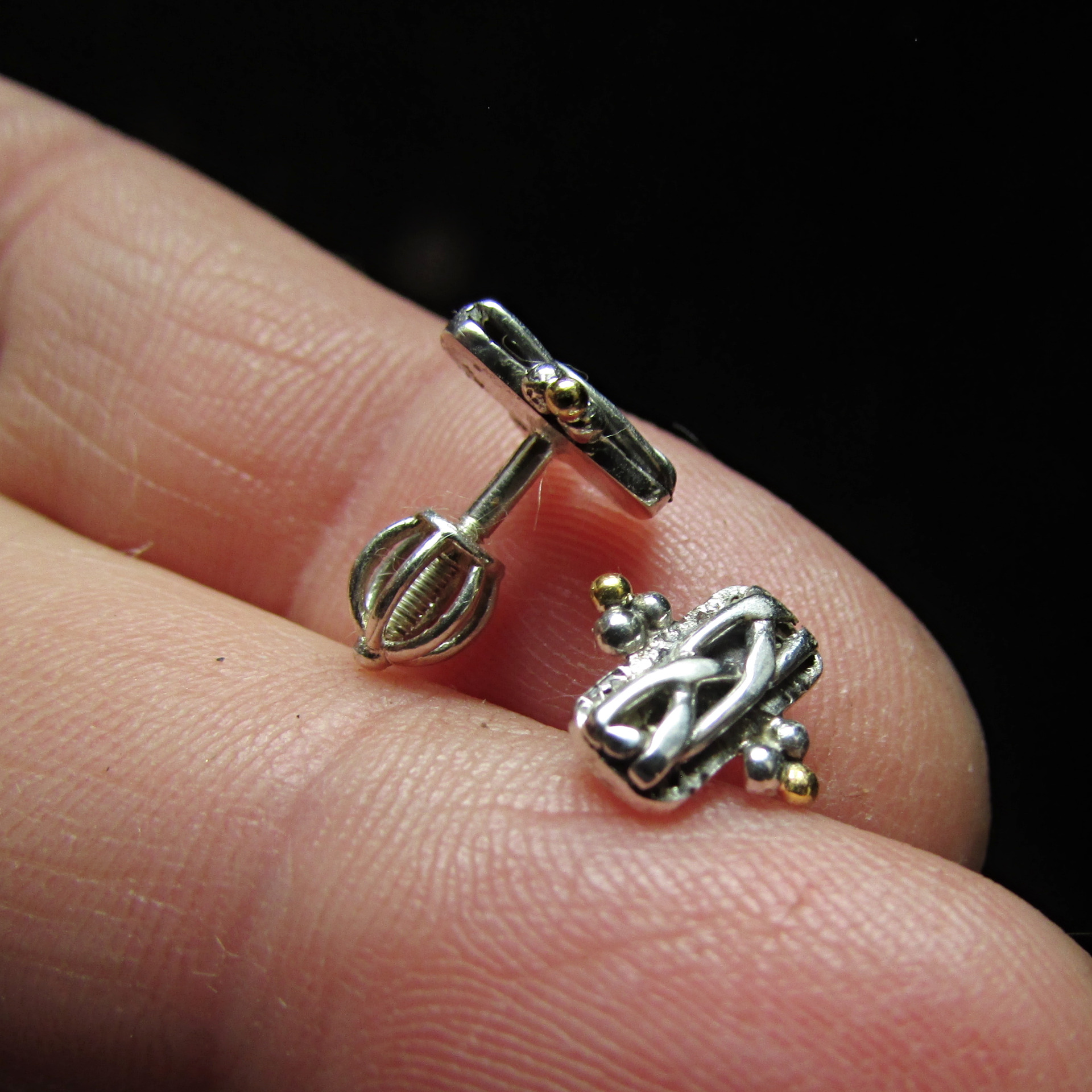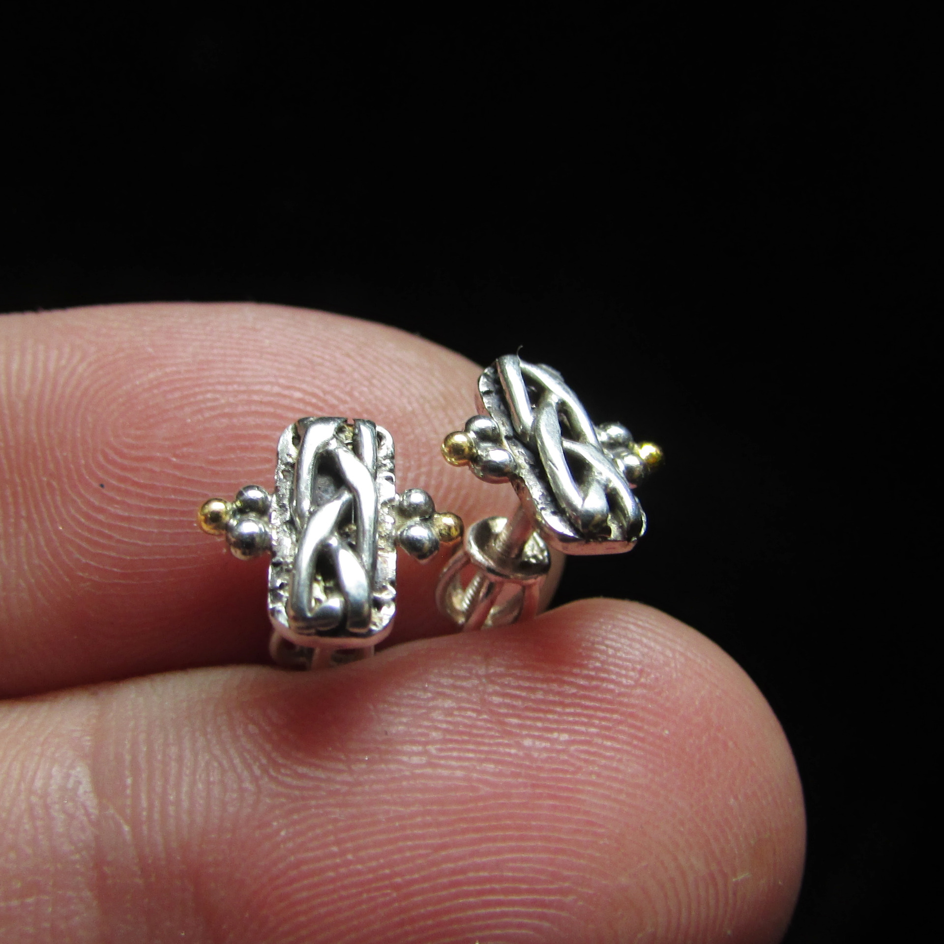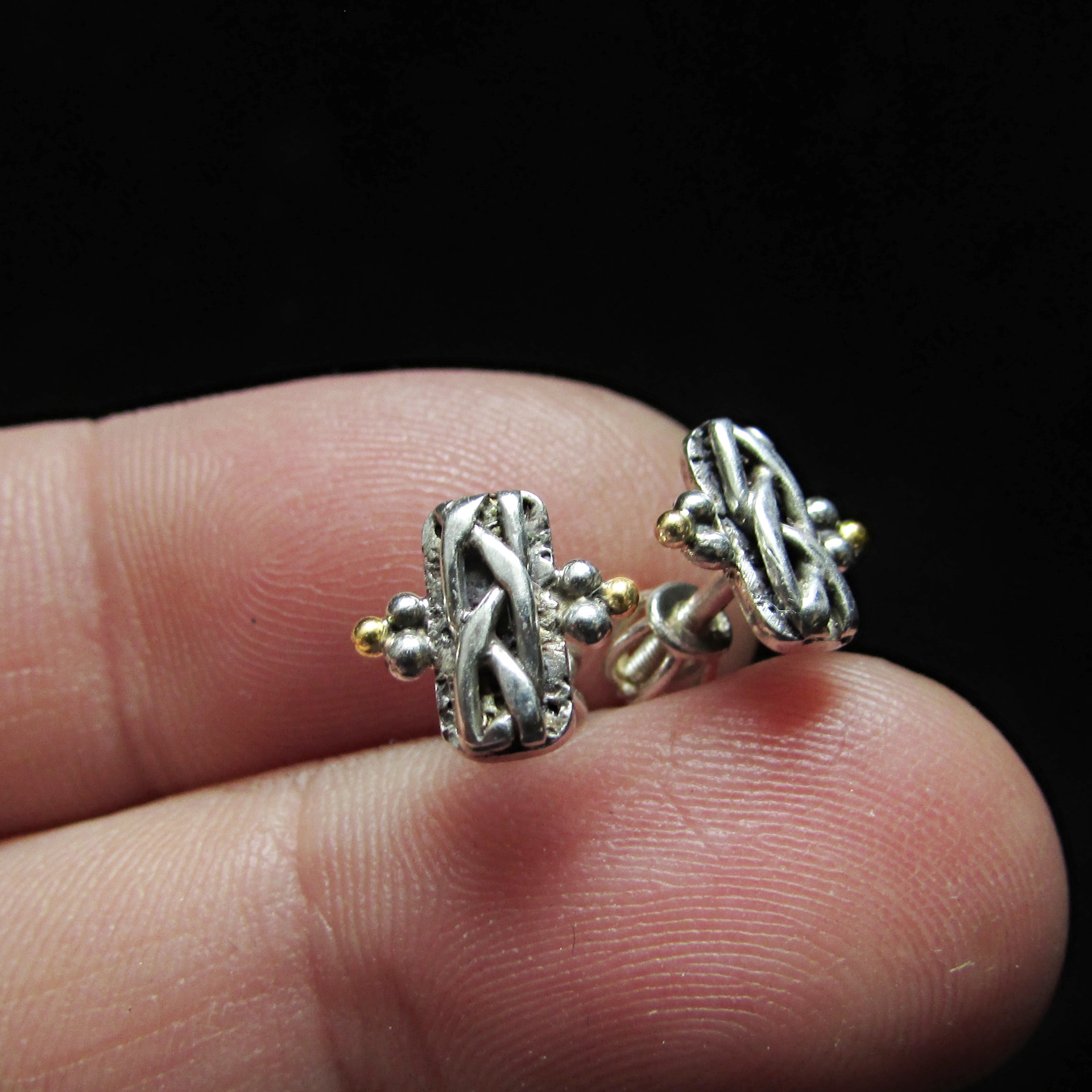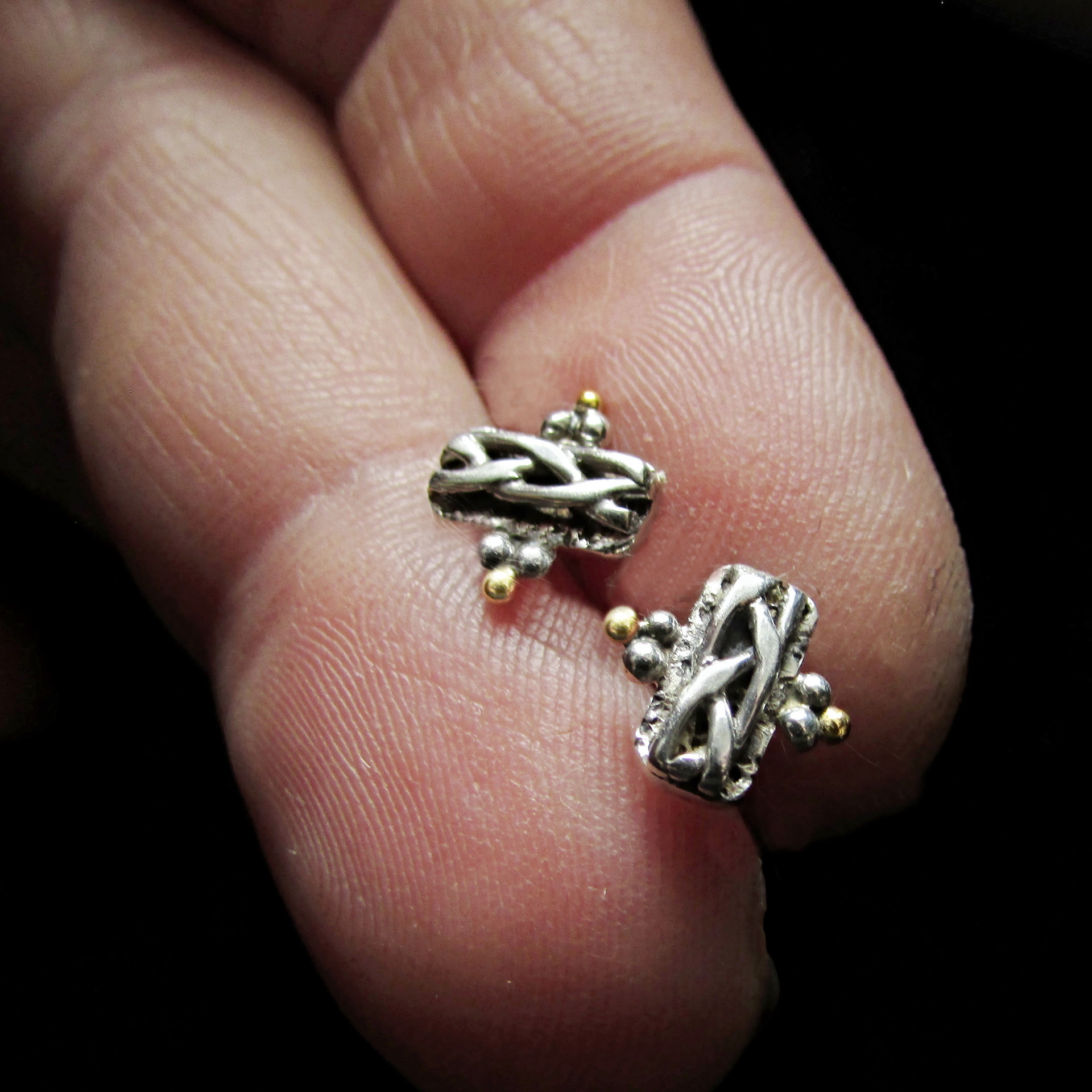 Stříbrné náušnice pecky ryzost 925/1000 se zlatými akcenty (kuličky) ze žlutého zlata ryzosti 585/1000. Zajištěno stříbrným šroubovacím balonkem. Balonek při dotažení velmi dobře drží, jde o spolehlivou pojistku náušnice.