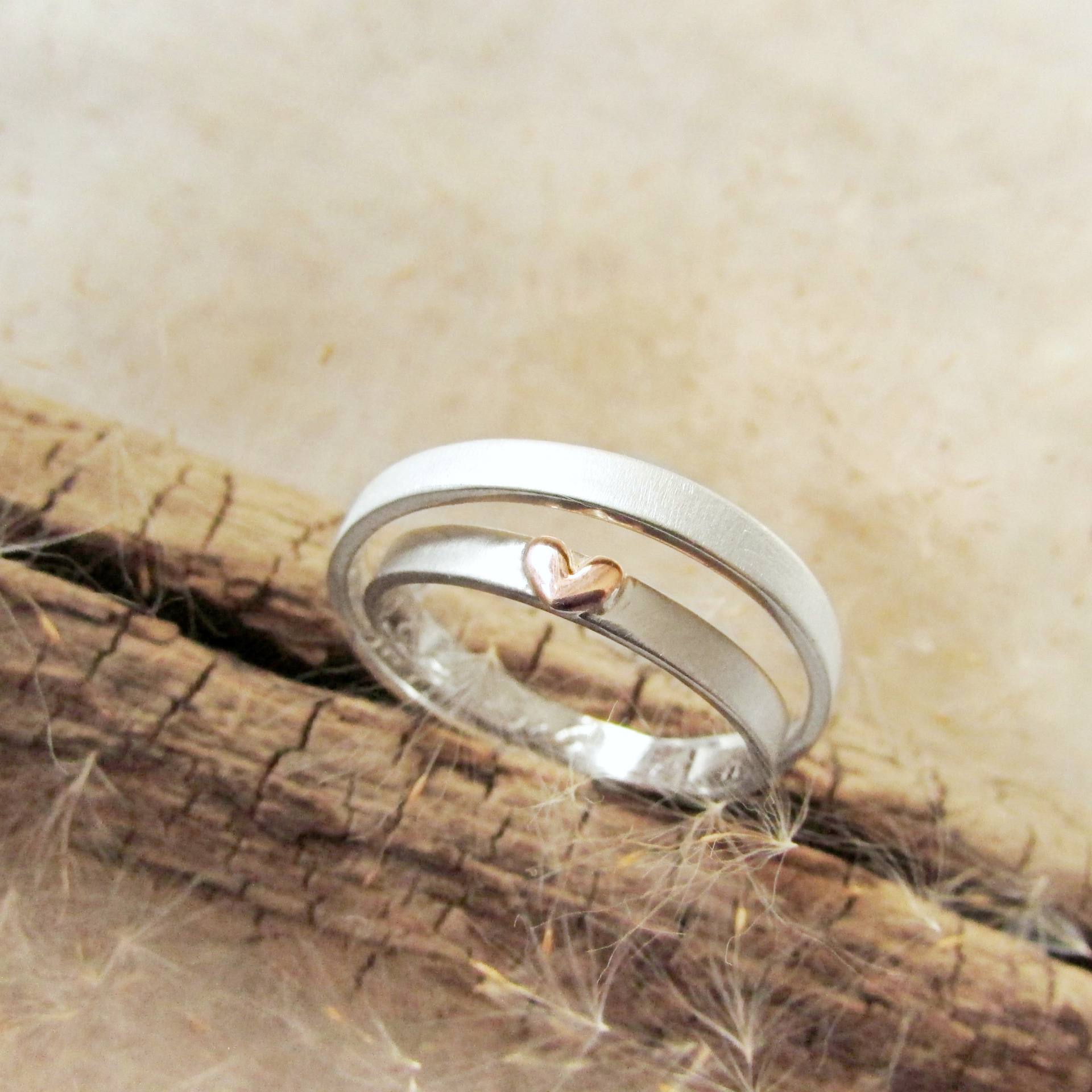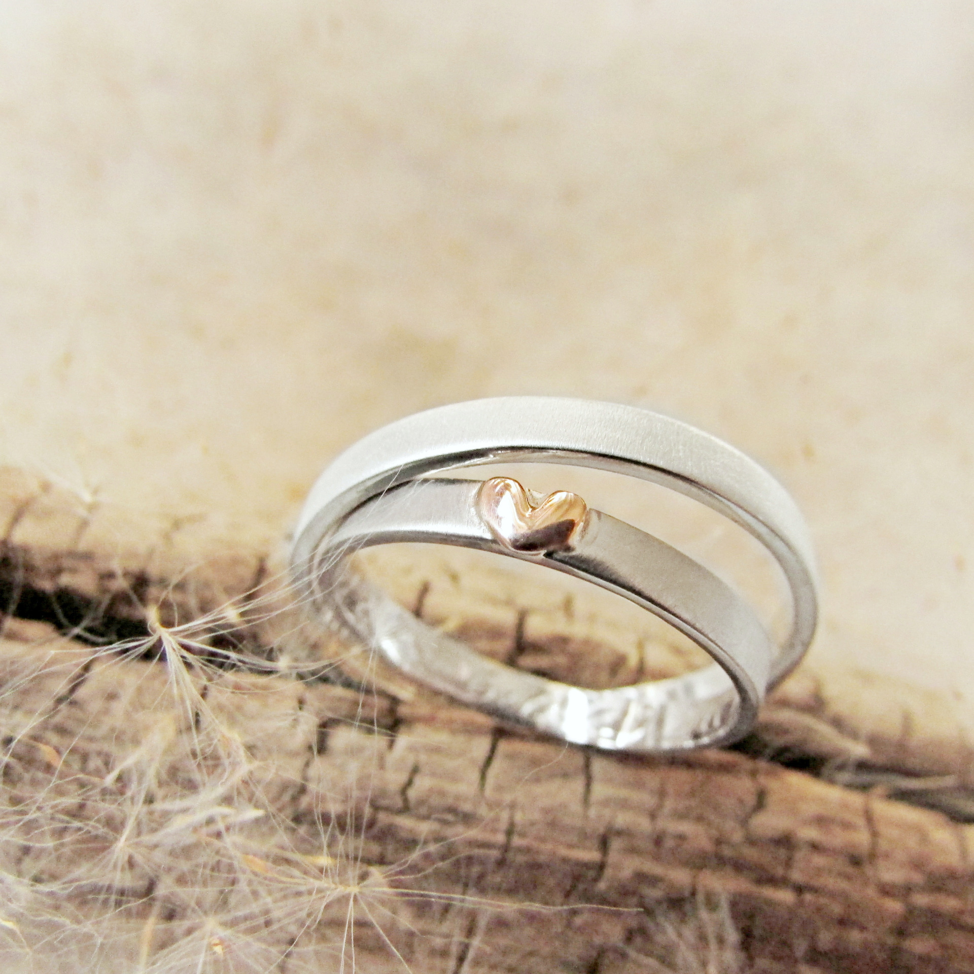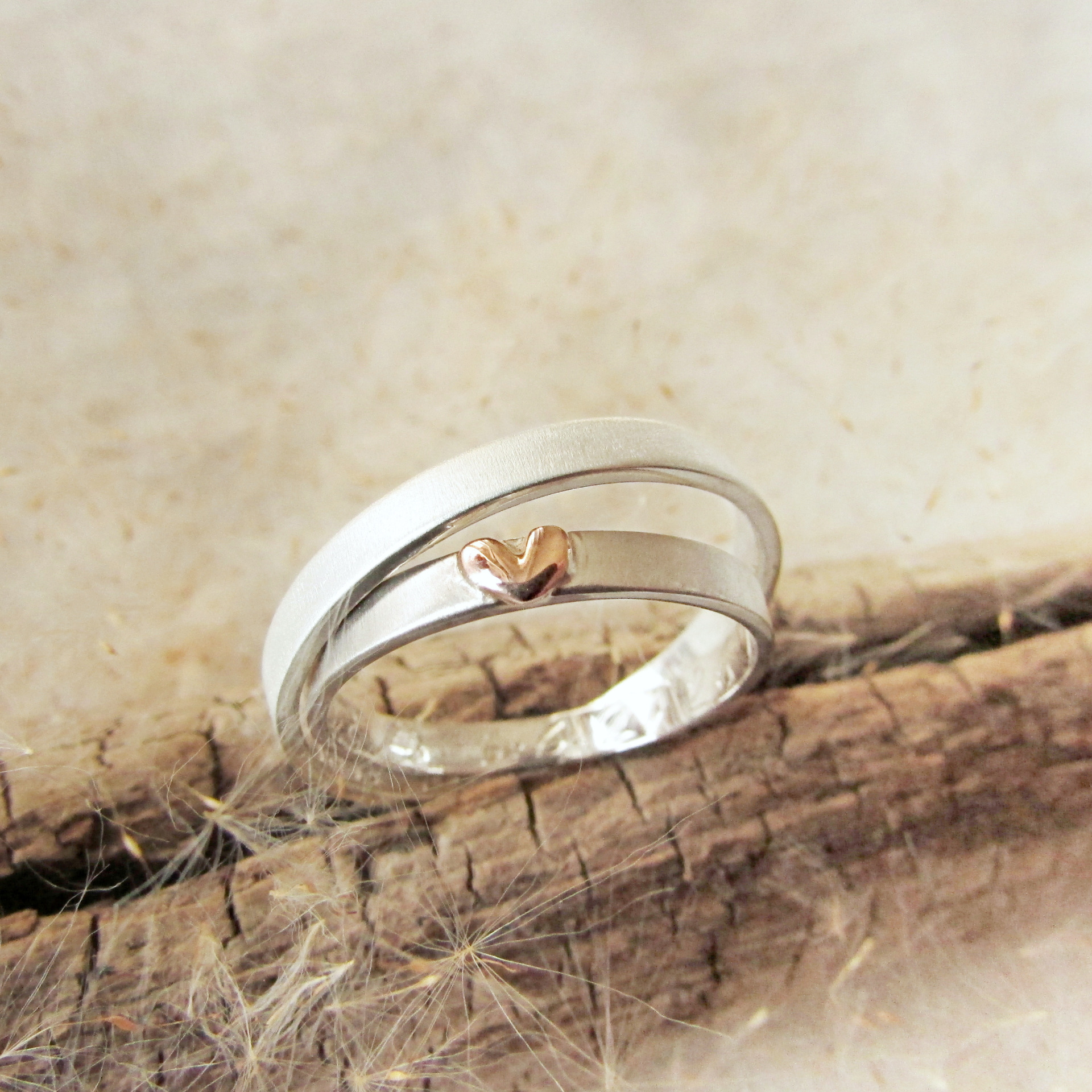 Snubní prsteny s hedvábnou texturou a růžovým zlatým srdíčkem...