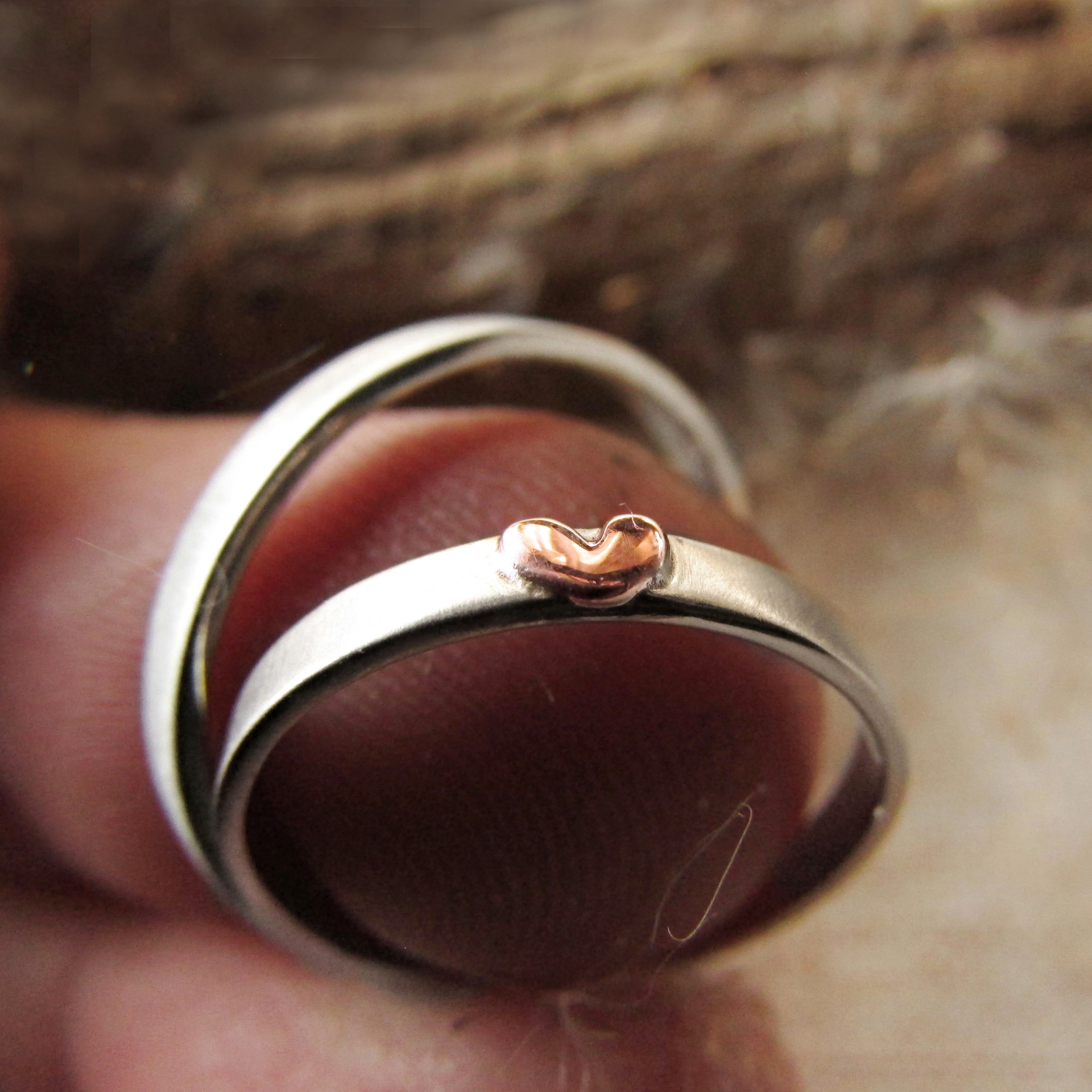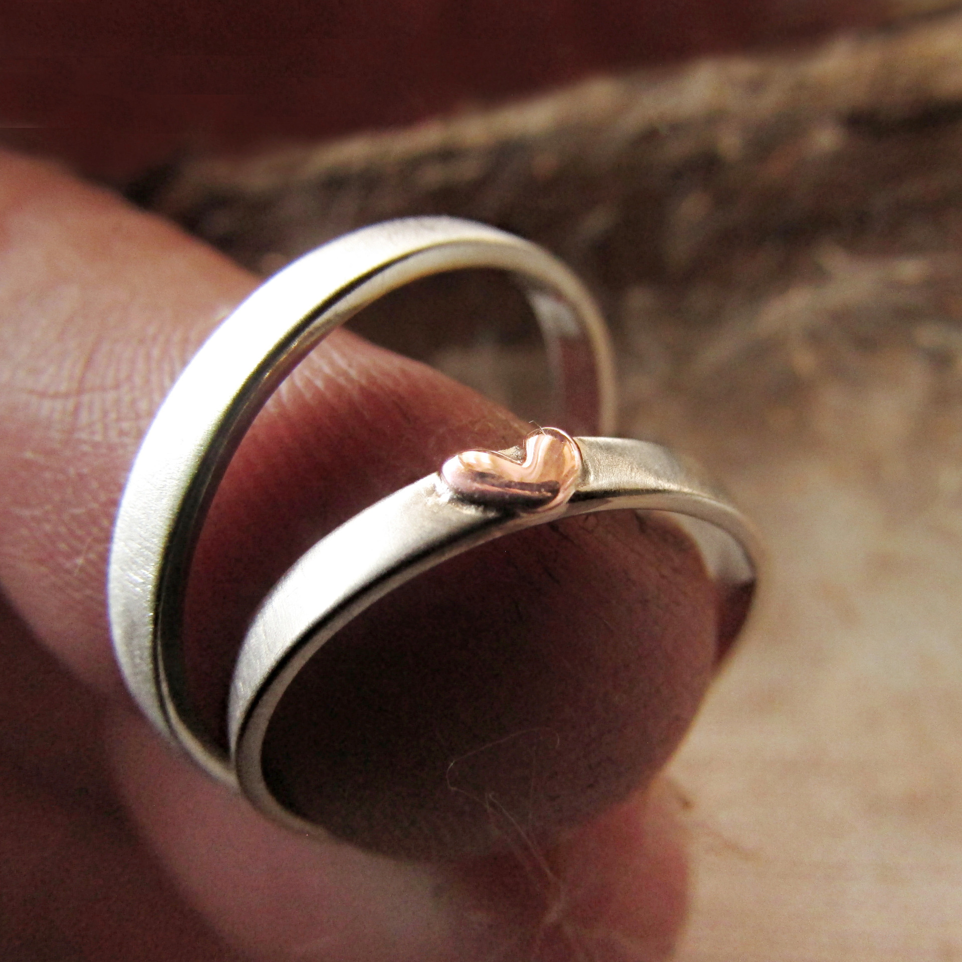 PROVEDENÍ: Kombinace dvou drahých kovů - stříbro (Ag 925/1000), bílé zlato (Au 585/1000) a srdíčko z růžového zlata (Au 585/1000). Struktura kroužků je po celém obvodu jemně hedvábná, matná. Kontrast k ní tvoří zlaté srdíčko, které je ve vysokém lesku.