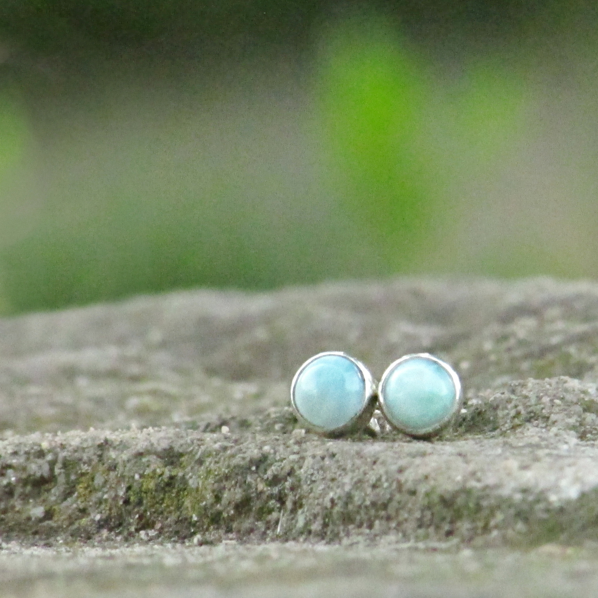 Stones: quality round larimar cabochons (5.5 mm), hand cut in the Czech Republic. The color is light bluish, turquoise. Soft shades and texture of sea water. They have a polished surface, they are not translucent.