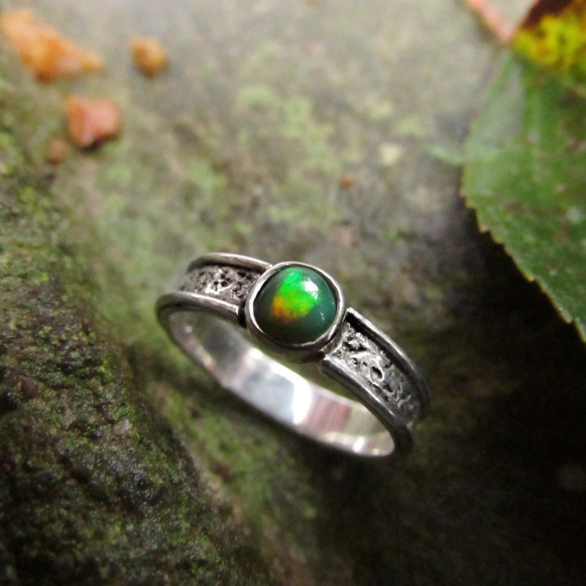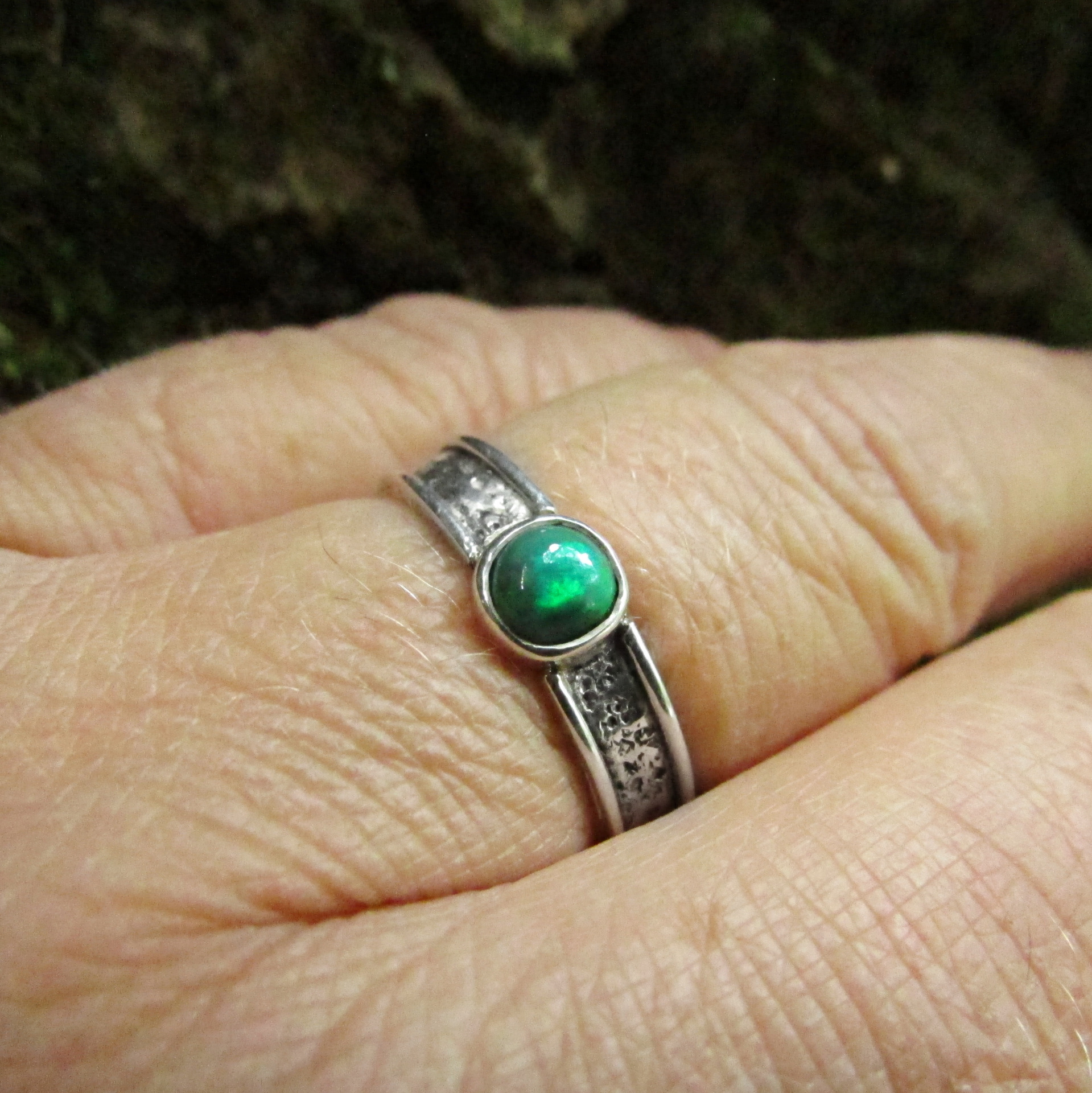 Zemitý kroužek s leskem pravého tmavého opálu.