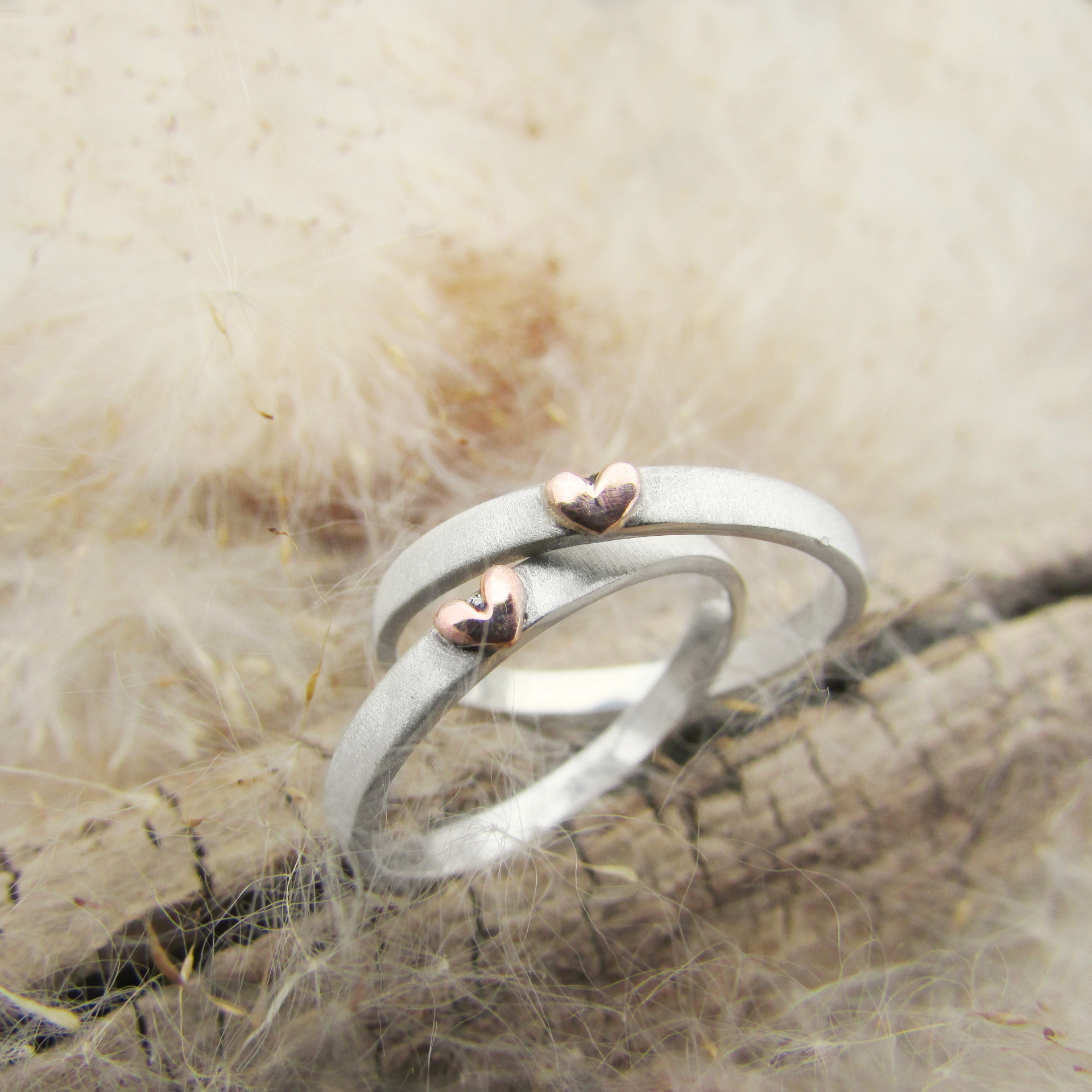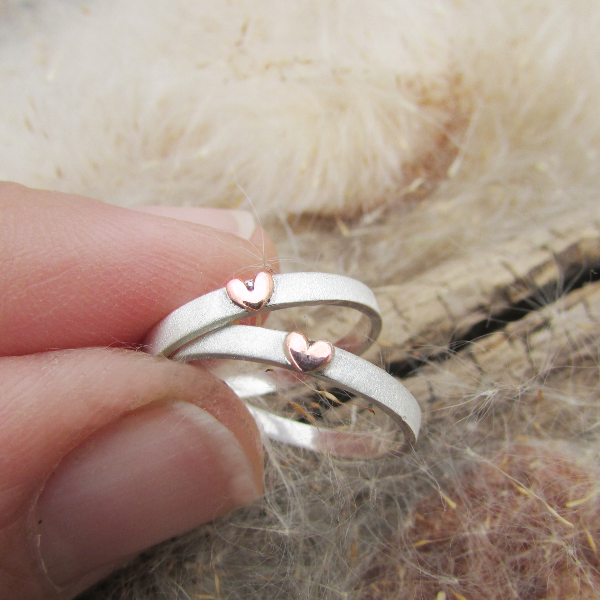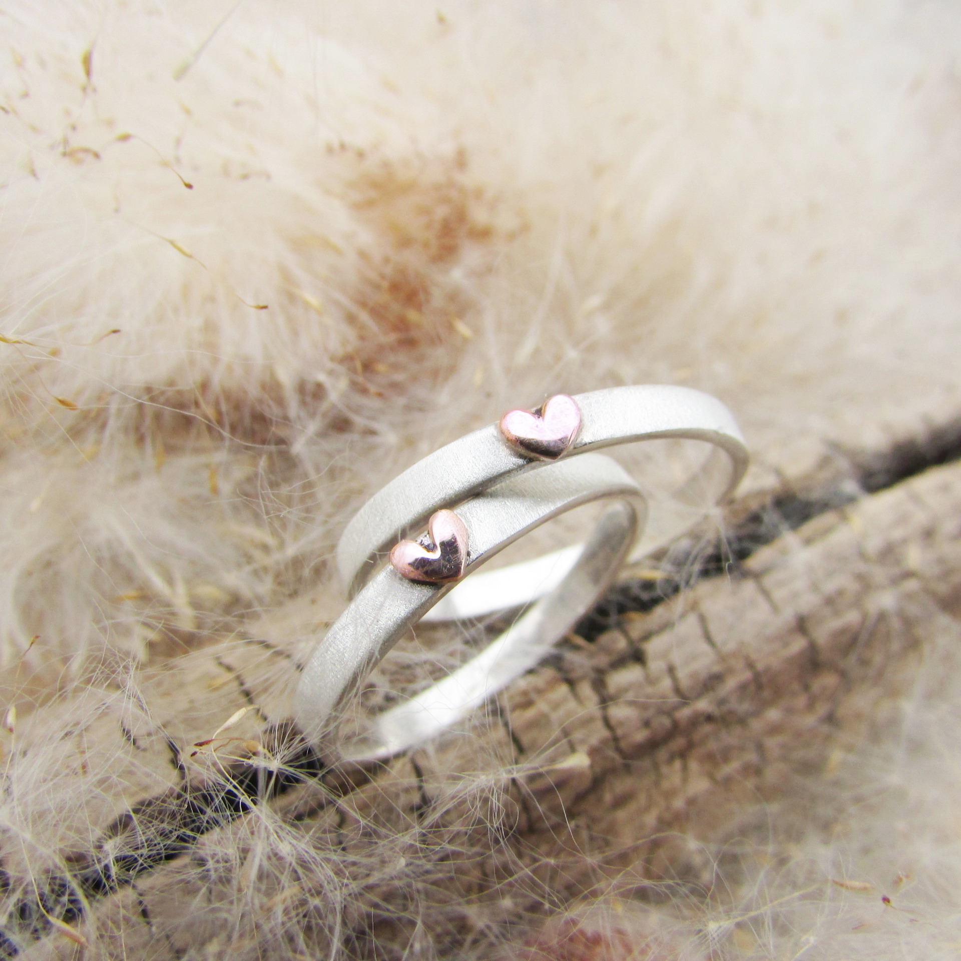 Stříbrný prsten s hedvábnou texturou a růžovým zlatým srdíčkem....